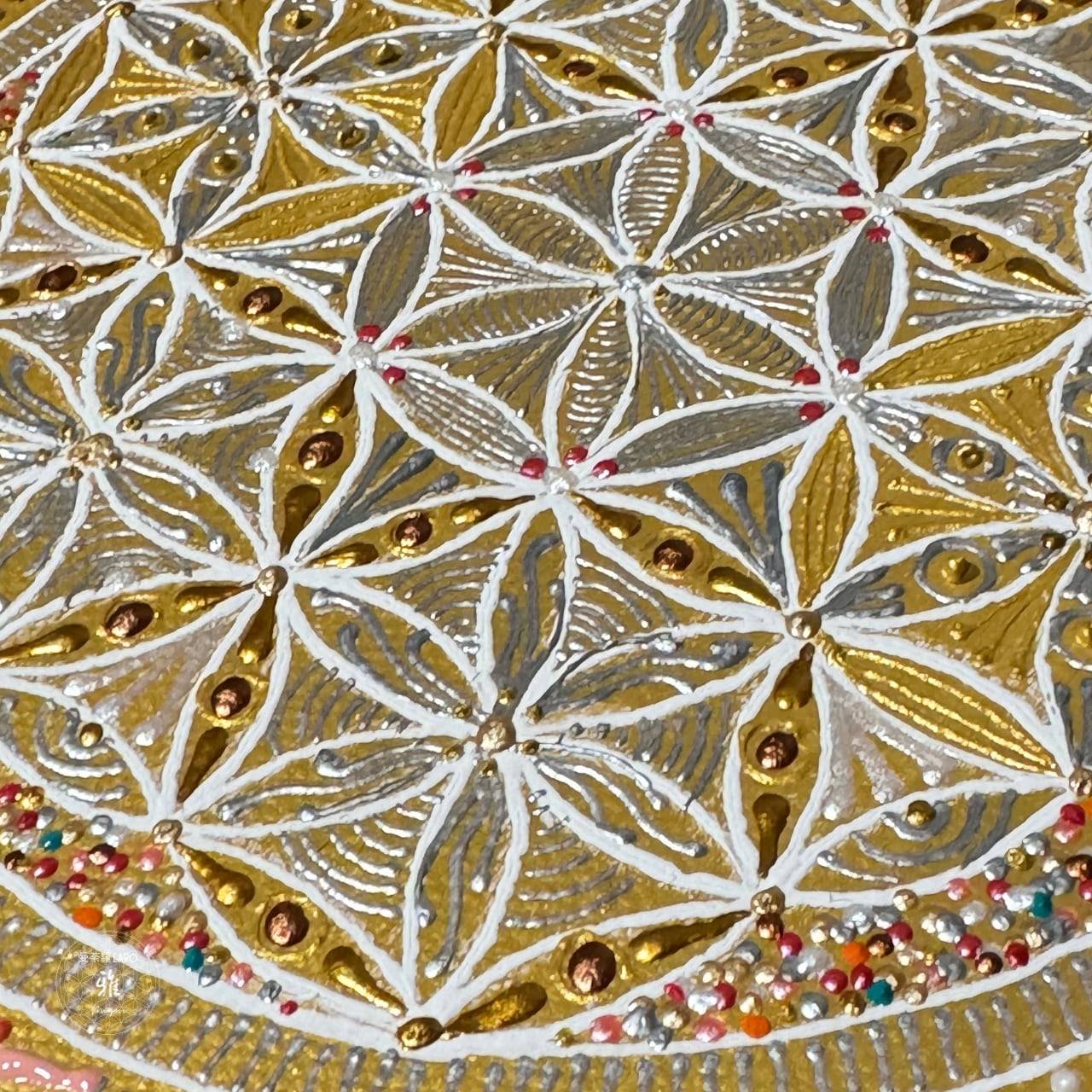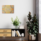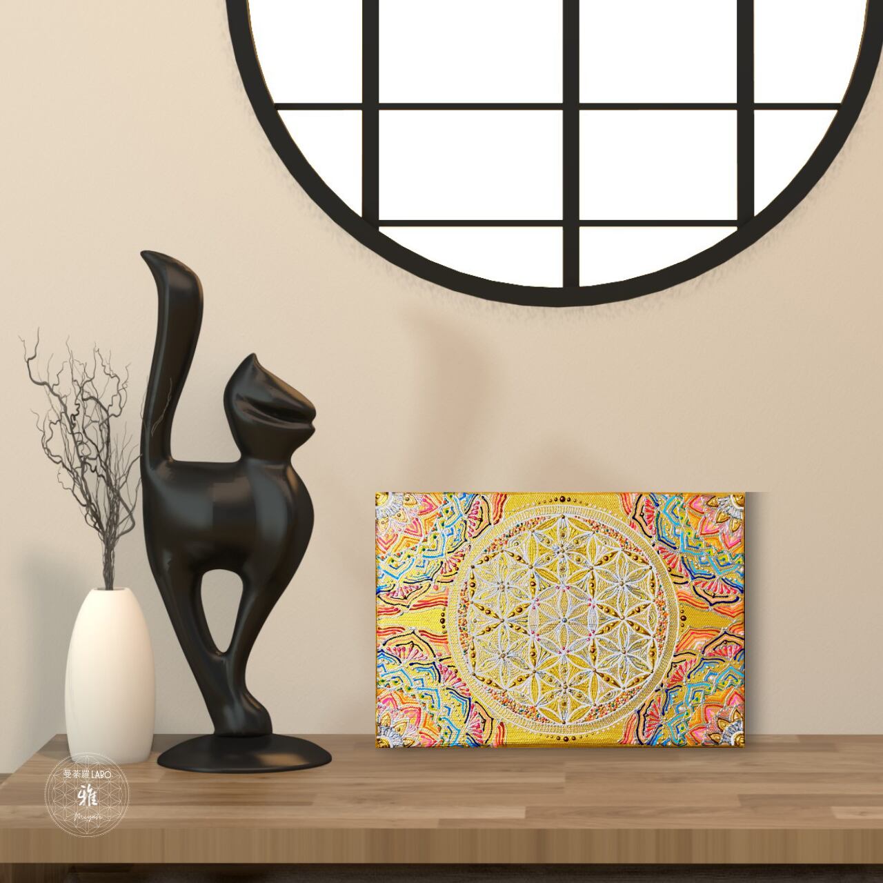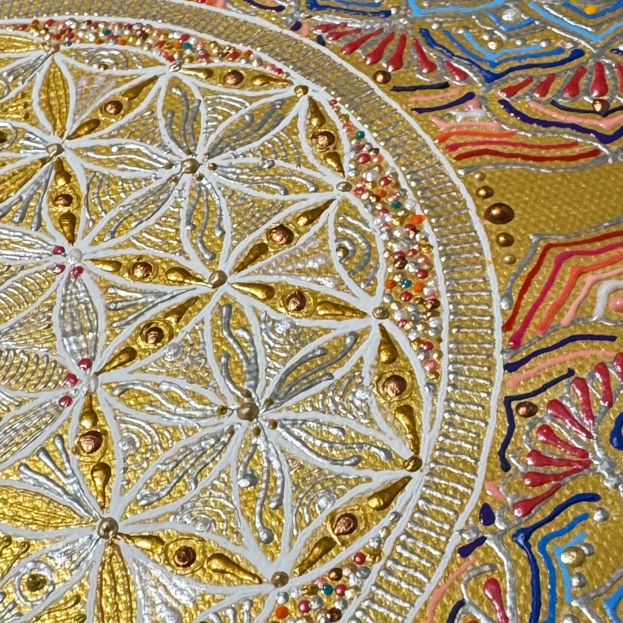 風水でも人気の高いゴールド(金色)の背景に、神聖幾何学のフラワーオブライフを描いています。